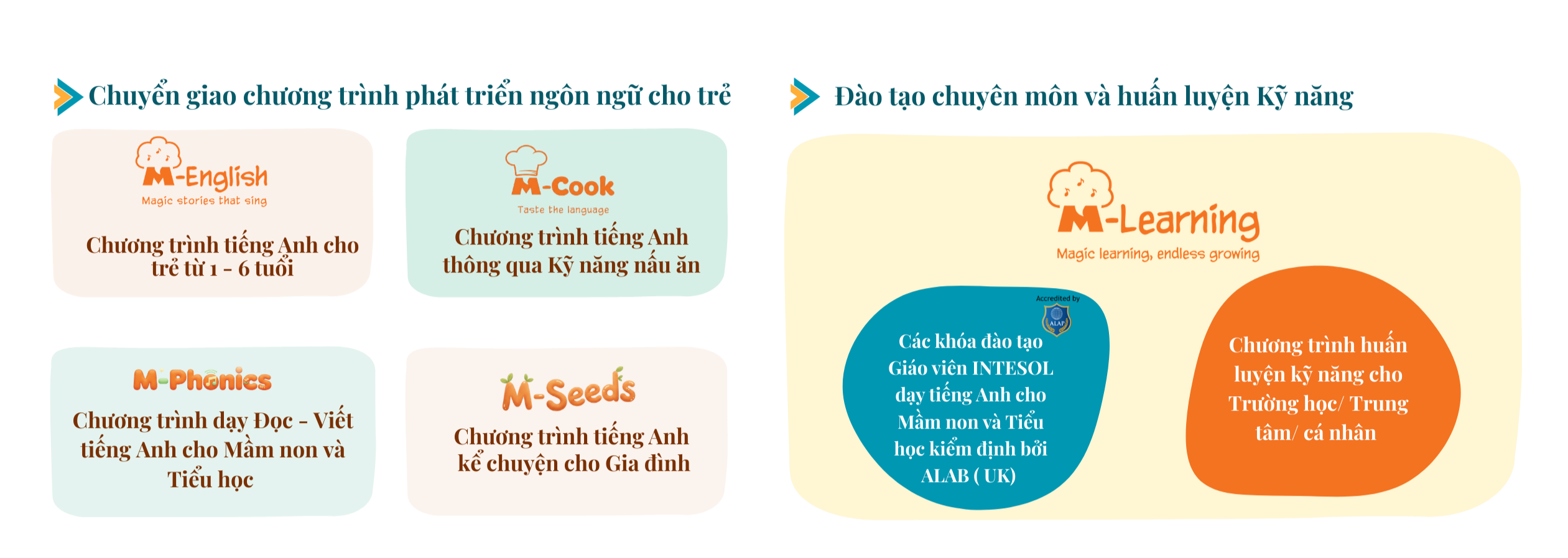 ✔ M-English là chương trình tiếng Anh cho trẻ 1–6 tuổi, ứng dụng phương pháp dạy tiếng Anh qua cơ chế thẩm thấu tự nhiên – mỗi bài học là một câu chuyện biết hát.✔ Trẻ không chỉ học từ vựng hay phát âm, mà học qua truyện kể - âm nhạc - kịch nghệ - biểu diễn giúp ghi nhớ tự nhiên và nuôi dưỡng sự tự tin.✔ Chương trình có giáo trình bài bản, hệ thống đào tạo giáo viên chuyên nghiệp, giáo cụ phong phú, dễ triển khai tại trường và hiệu quả lâu dài.✔ Tạo điểm khác biệt rõ ràng trong tuyển sinh, nâng cao chất lượng giảng dạy đồng bộ , dễ đánh giá, triển khai.