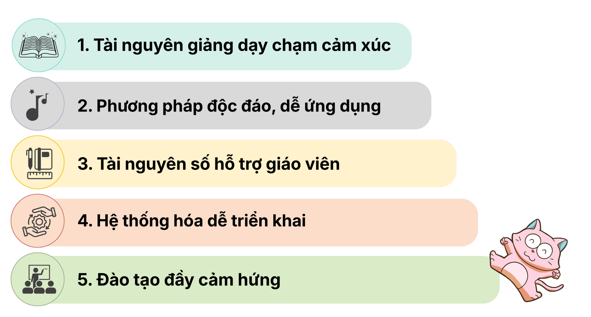 Giáo trình, giáo cụ, tài liệu hướng dẫn, mẫu kế hoạch bài học, rubric đánh giá… giúp giáo viên có thể triển khai ngay khi hoàn thành khóa học.• Mục tiêu: đào tạo người làm nghề, không chỉ người tham gia khóa học